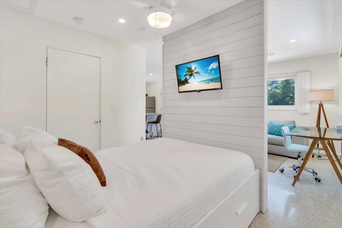 “Clean, modern property in a quiet, convenient location! The studio seemed to be recently updated and impeccably clean with larger than expected kitchen and bath spaces. It's attached to a larger rental but has it's own parking and entrance that made us feel like it was it's own rental. The shared outdoor area was spacious and well-equipped with ample seating, lounging, etc and a gorgeous pool and hot tub. We were delighted to find a beach wagon, chairs and other items to use for the nearby beaches. Nokomis beach was surprisingly close (short drive through the neighborhood, no main roads) but we also had fun checking out other beaches and tiki bars less than 10 mins away. There's lots of options nearby! Would definitely stay here again.”