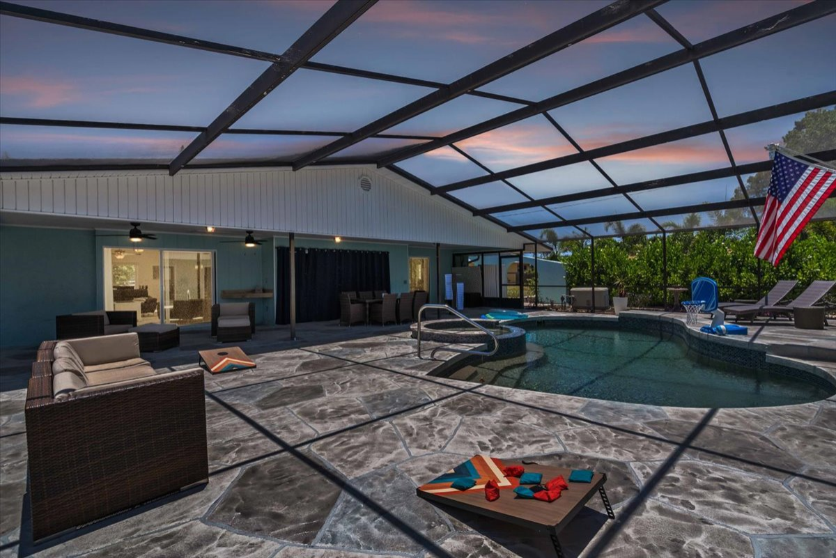 Step inside to find a spacious and perfectly furnished living area, ideal for relaxation and entertainment. The well-equipped kitchen boasts modern appliances and plenty of counter space, perfect for preparing delicious meals. The outdoor oasis is where the Nokomis Pearl truly shines. The outdoor oasis area may be shared with other guests at the house. Enjoy the beautiful pool and jacuzzi, surrounded by a large pool deck with room for grilling, games, dining, or lounging in the sun, providing a private sanctuary for your leisure. Whether you're lounging by the pool, soaking in the Jacuzzi, or dining al fresco on the patio, every moment here is pure bliss.The bedroom area is thoughtfully designed to offer a restful haven, featuring comfortable beds and ample storage space. The two bathrooms are tastefully appointed, ensuring convenience and comfort for all guests.