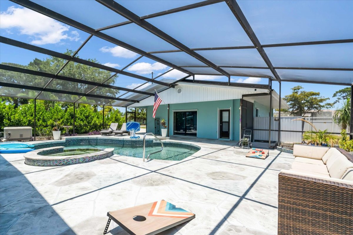 Step inside to find a spacious and perfectly furnished living area, ideal for relaxation and entertainment. The well-equipped kitchen boasts modern appliances and plenty of counter space, perfect for preparing delicious meals. The outdoor oasis is where the Nokomis Pearl truly shines. The outdoor oasis area may be shared with other guests at the house. Enjoy the beautiful pool and jacuzzi, surrounded by a large pool deck with room for grilling, games, dining, or lounging in the sun, providing a private sanctuary for your leisure. Whether you're lounging by the pool, soaking in the Jacuzzi, or dining al fresco on the patio, every moment here is pure bliss. Both bedrooms are thoughtfully designed to offer a restful haven, featuring comfortable beds and ample storage space. The two bathrooms are tastefully appointed, ensuring convenience and comfort for all guests.