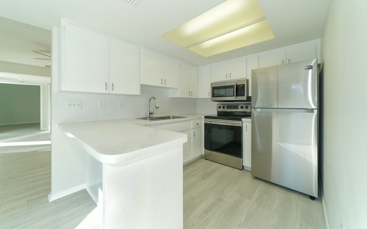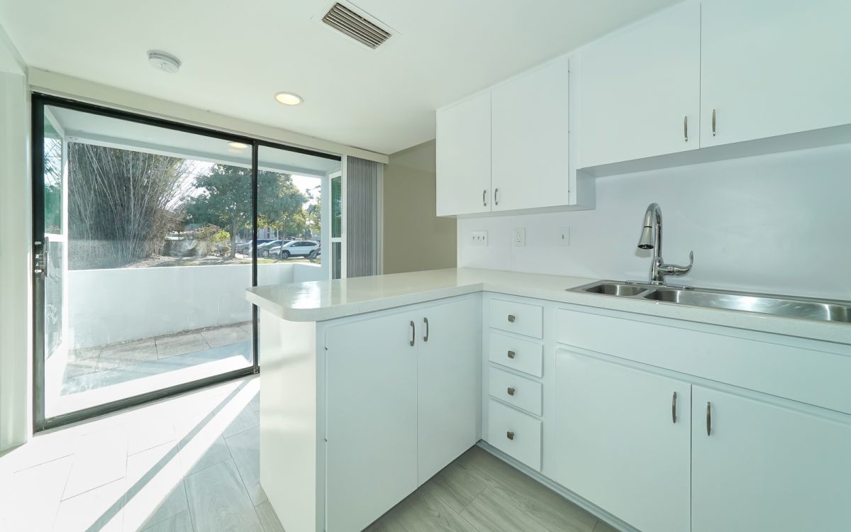 The kitchen is spacious and well-lit, with plenty of custom cabinetry, eat-in breakfast bar countertop, re-laminated counters and stainless steel appliances including a microwave, smooth-top stove and refrigerator. Over-sized sink and faucet with garbage disposal make clean up easy. Added bonus: Enjoy having meals or drinks outside on your own private outside patio area.